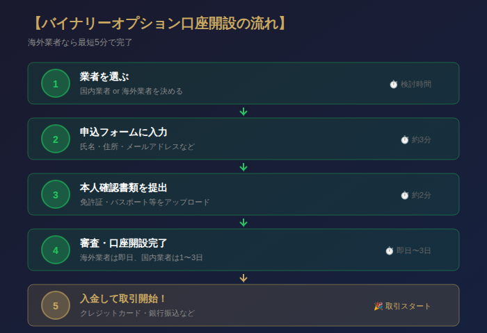 結論から言うと、バイナリーオプションの口座開設は最短5分で完了する。特に海外業者なら、必要書類さえ揃っていれば即日で取引を始められる。
