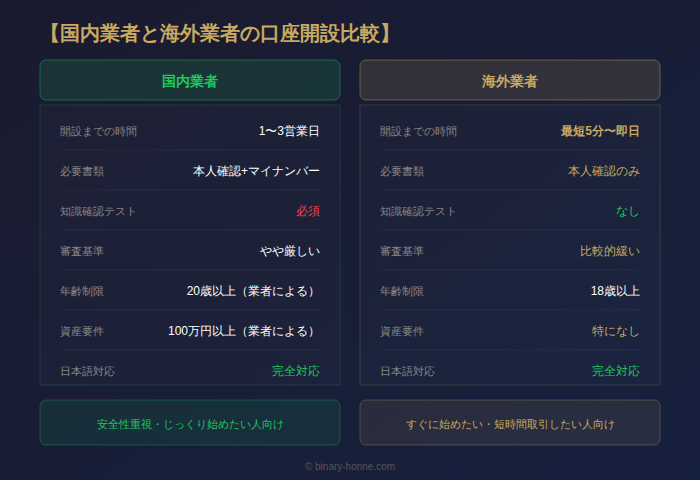 • 海外業者:最短5分で完了、テスト不要、資産要件なし