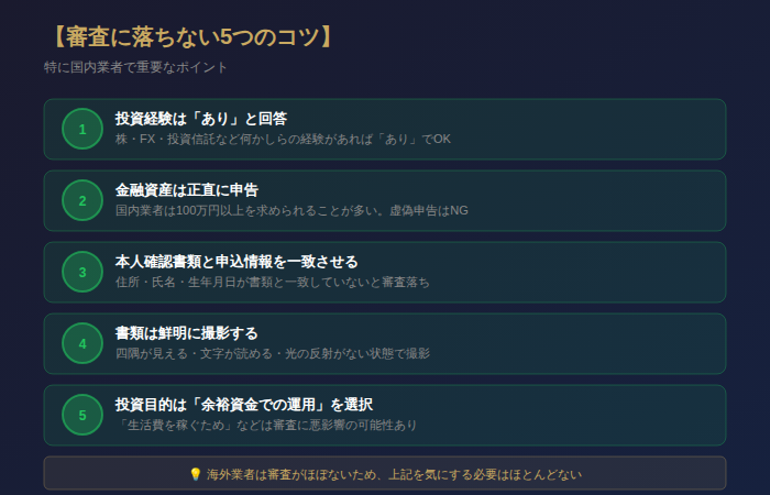 国内業者は金融庁の規制を受けているため、「顧客保護」の観点から審査基準が厳しい。