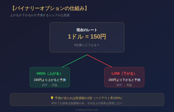 バイナリーオプションは、為替レートが「上がるか」「下がるか」を予測する投資。