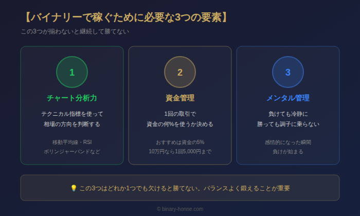 バイナリーオプションで稼ぐには、以下の3つが必要。