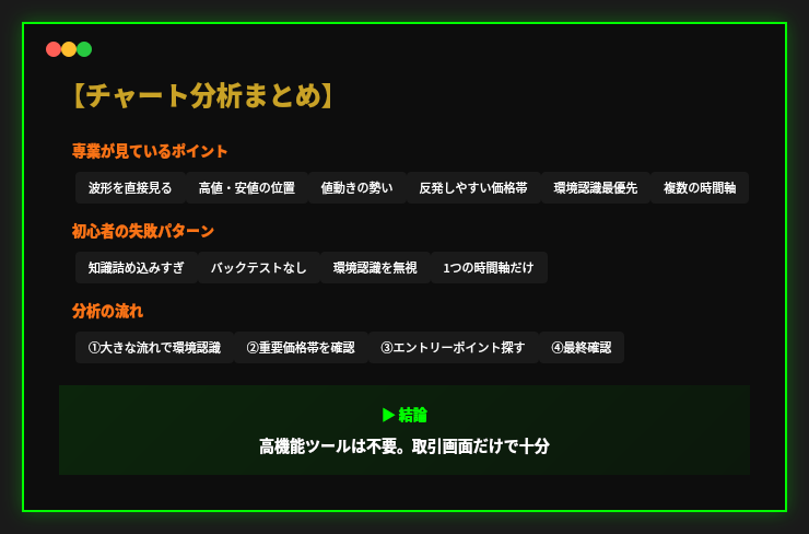 高機能なツールは必要ない。私もありとあらゆるインジケーターを試した結果、取引画面のチャートだけで十分だという結論に至った。まずは波形を見ることから始めて、徐々にレベルアップしていこう。