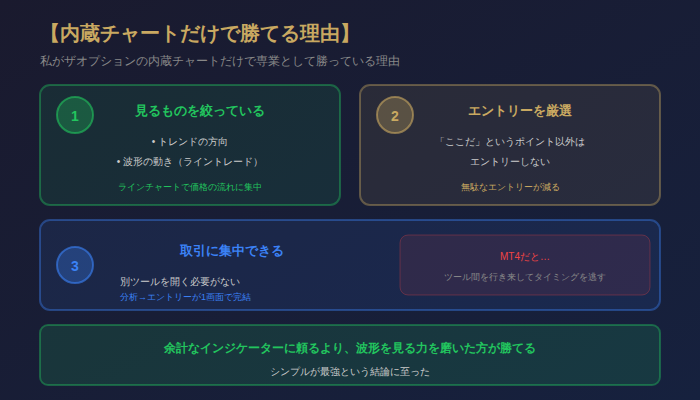 私は今、ザオプションの内蔵チャートだけで取引している。MT4もTradingViewも使っていない。それでも専業として十分に利益を出せている。