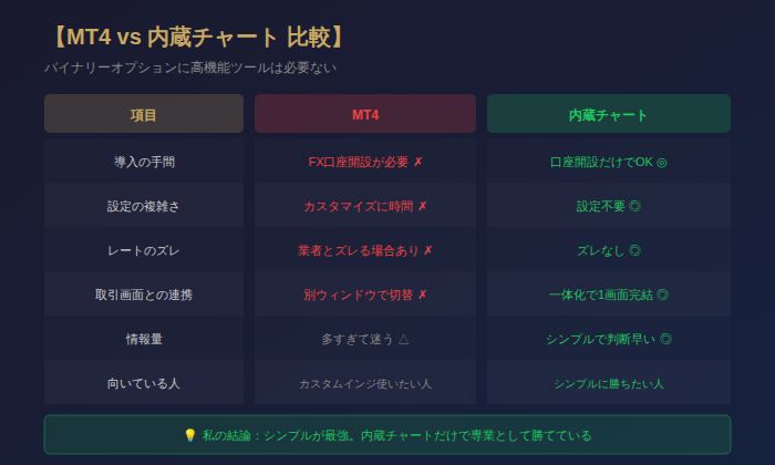 これが一番の問題だ。バイナリーオプションに、MT4ほどの高機能ツールはそもそも必要ない。
