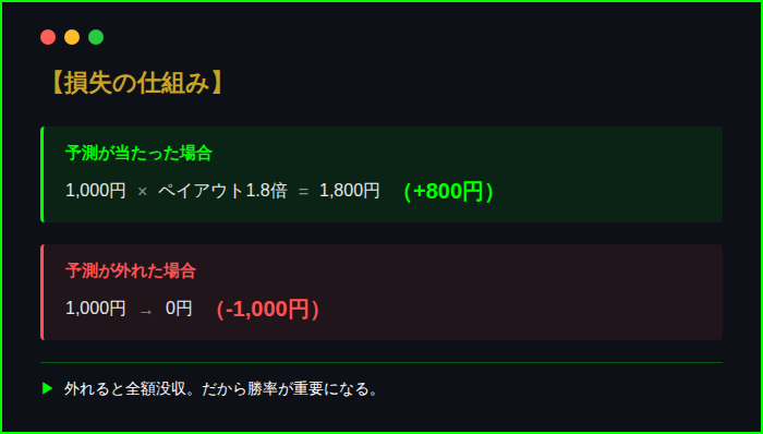 FXなら損切りで損失を抑えられるが、バイナリーオプションは「勝つか、全額負けるか」の二択。1,000円賭けて外れたら、1,000円が丸ごと消える。途中で「やっぱりやめた」ができない。