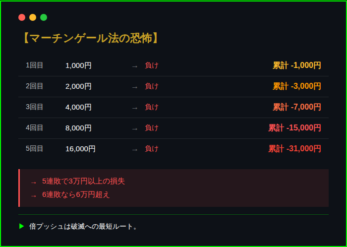 問題は、この「限定されたリスク」を甘く見て、何度も負けを繰り返すこと。1回1,000円でも、100回負ければ10万円。この感覚を忘れると危険だ。