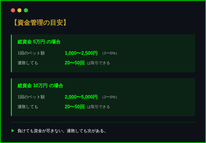 こうすれば、20〜50連敗しない限り資金は尽きない。「負けても次がある」という余裕が、冷静な判断を可能にする。