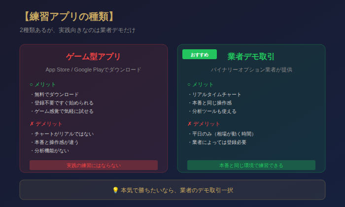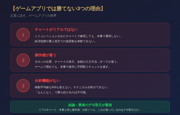 ゲームアプリは「バイナリーオプションとは何か」を知るには良いが、実践の練習にはならない。