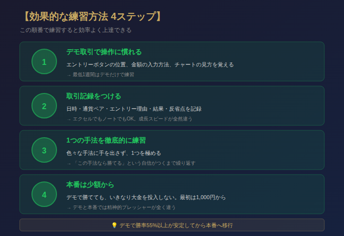 デモでも取引記録をつける。「なぜエントリーしたか」「結果はどうだったか」「反省点は何か」を記録する。