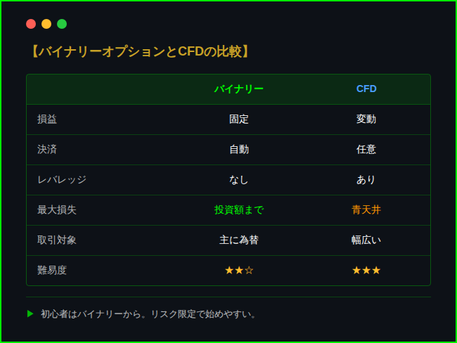 バイナリーオプションとCFDの違い|仕組み・リスク・向いてる人を比較