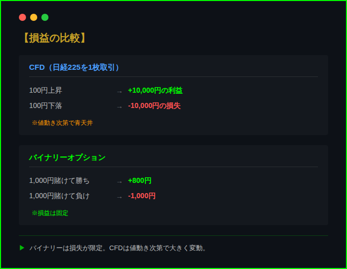 • 損益:バイナリー=固定、CFD=変動