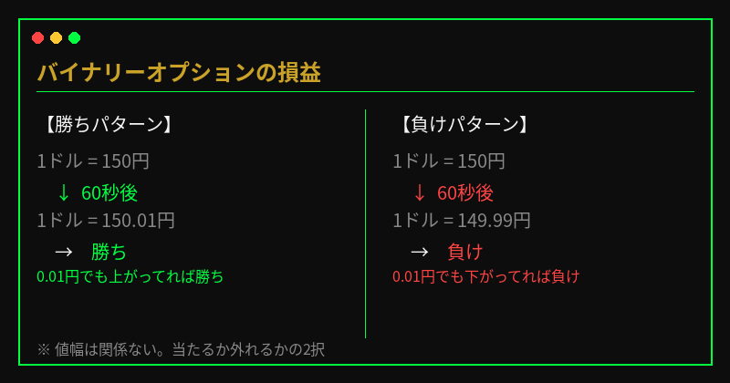 | 仕組み | 値幅で決まる | 2択で決まる |