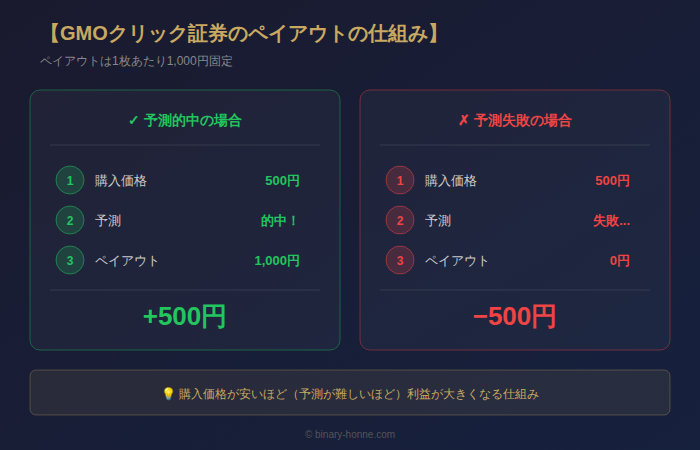 • 購入価格500円 → 予測的中 → ペイアウト1,000円 → 利益500円