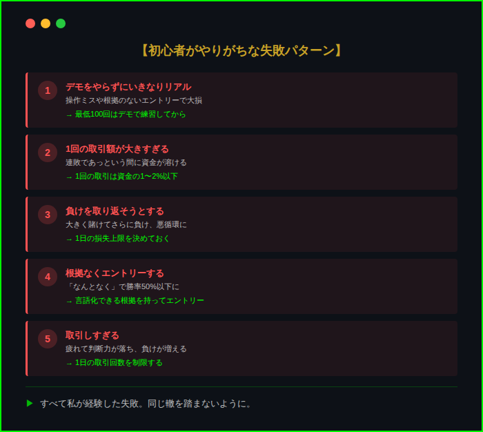 失敗パターン 「デモは時間の無駄」「早く稼ぎたい」と思って、いきなりリアルマネーで取引。操作ミスや根拠のないエントリーで大損。