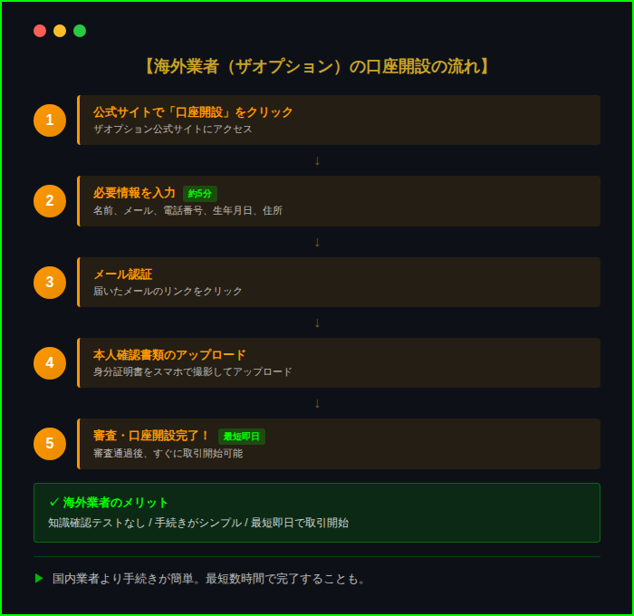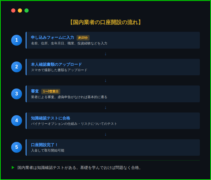 海外業者(ザオプションなど)は、書類に問題がなければ数時間で開設完了することも。国内業者は審査に時間がかかる。