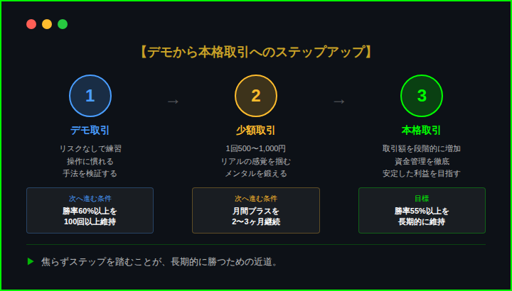 最低100回以上はデモで取引してから、リアルマネーに移行すること。勝率60%以上を安定して出せるようになるまで、焦らずデモで練習すべき。