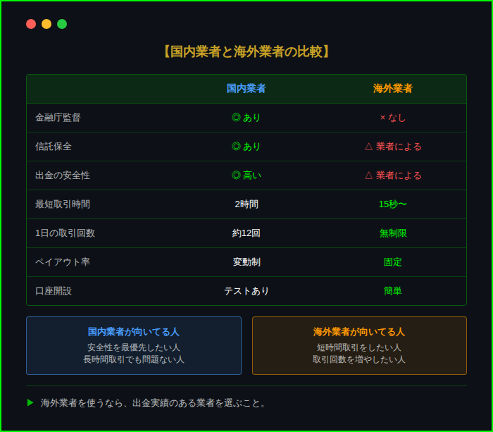 「違法」というイメージがあるのは、無登録業者による詐欺被害が多発しているから。金融庁に登録されている国内業者、または出金実績のある海外業者を使えば問題ない。