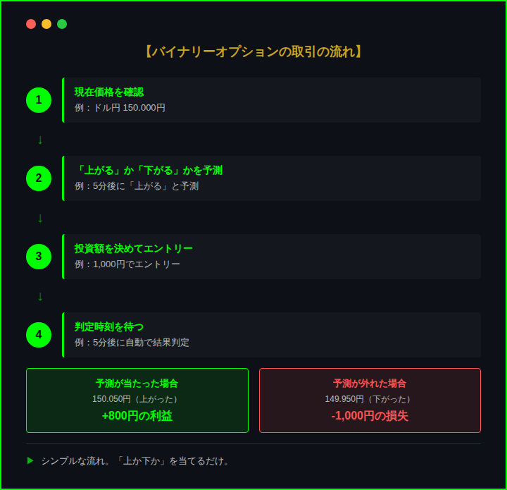 これがバイナリーオプションの基本的な流れ。「上か下か」を当てるだけ。非常にシンプル。