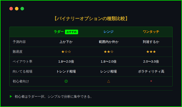 バイナリーオプションには、主に3つの取引タイプがある。
